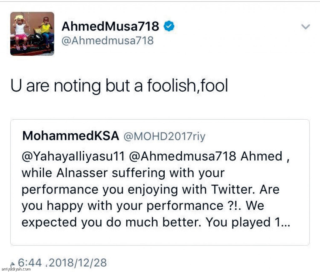 أطلق مغردون هاشتاقًا بعنوان #النصرأكبرمنأحمدموسى عبر موقع التواصل الاجتماعي تويتر، أمس، وذلك بعد كتابة المحترف النيجيري في صفوف النصر تغريدتين، ردَّ فيهما على مشجع نصراوي، انتقد مستواه خلال مواجهة الفتح. وقال موسى في تغريدته الأولى: "أنا لاعب سيئ مثلما تقول، لماذا لا تلعب أنت في الفريق بما أنك لاعب جيد". وأردف في تغريدة أخرى: "أنت تدلي بملاحظاتك لكنها ملاحظات حمقى". قبل أن يحذف التغريدتين بعد دقائق عدة. وبلغ مجموع التغريدات في الهاشتاق نحو 11 ألفًا في ساعتين من إطلاقه، وأثار رد موسى الكثير من الجدل عبر الطائر الأزرق.
