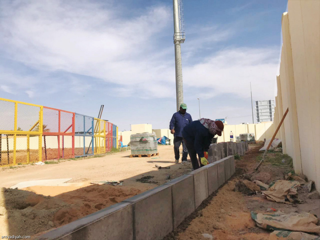 صورة التقطت لعاملين يشاركان أخيراً في تهيئة مرافق نادي الحزم في الرس لاستقبال العائلات خلال مباريات الفريق الأول على ملعبه في حال وافق اتحاد القدم على إعادته إليه علما أنه يخوض حاليا مباريات الدوري في بريدة تصوير: فهد البطاح