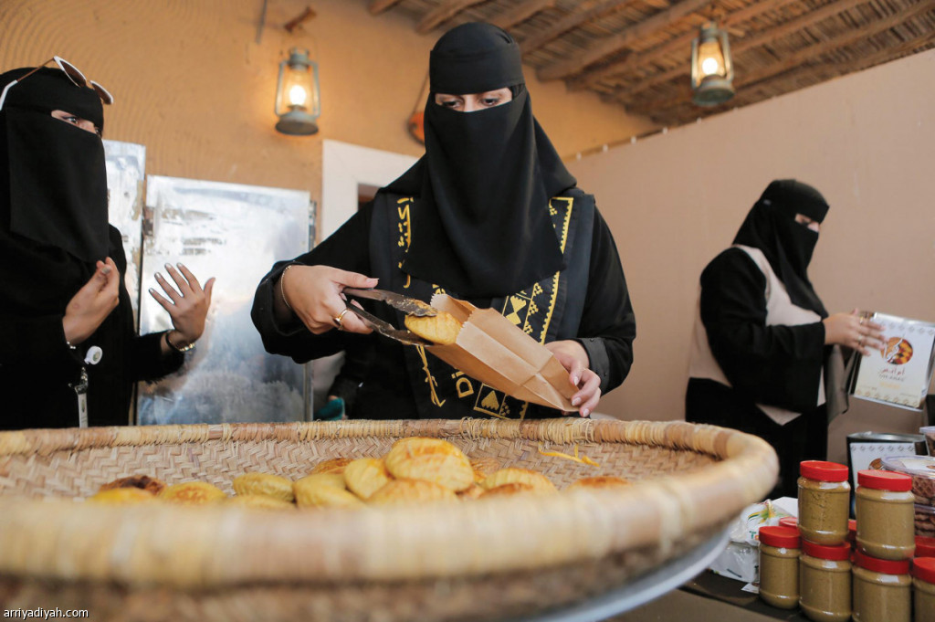صورة التقطت أمس لمشاركات من الأسر المنتجة أثناء بيع الكليجا لإحدى المتسوقات داخل جناح القصيم في المهرجان الوطني للتراث والثقافة في الجنادرية(واس)