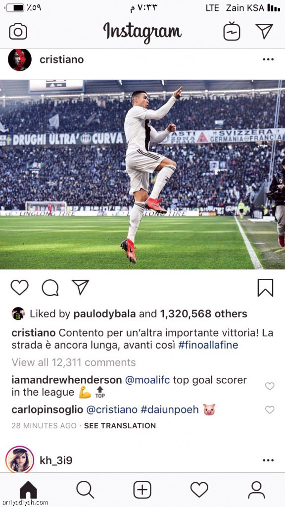 احتفل البرتغالي كريسيتانو رونالدو، محترف فريق يوفنتوس، عبر حسابه الشخصي في موقع التواصل الاجتماعي إنستجرام، بانتصار فريقه أمس، ضمن منافسات الدوري الإيطالي، ونشر صورة لاحتفاليته الخاصة بعد تسجيله أحد أهداف المباراة، ونالت نحو مليون معجب خلال 28 دقيقة من بثها وأكثر من 12 ألف معلق من متابعي النجم العالمي.