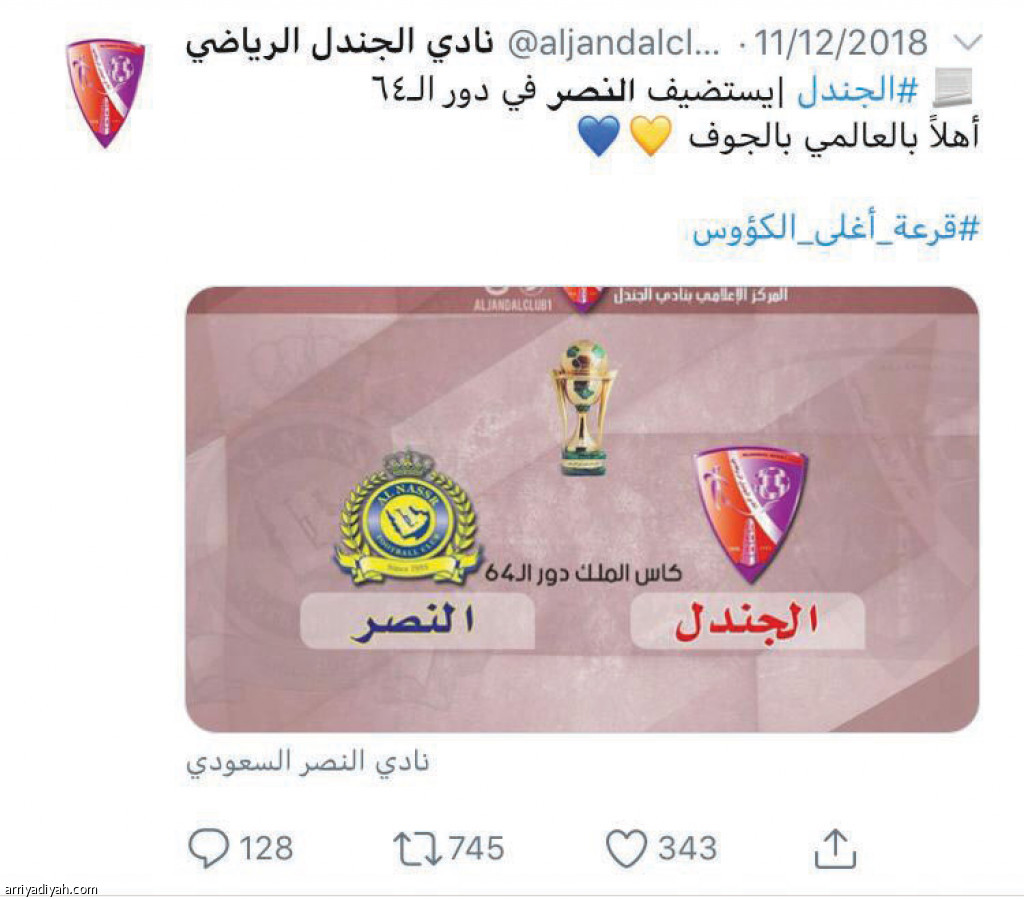 يواكب حساب نادي الجندل في موقع التواصل الاجتماعي "تويتر" إحداثيات الإعلام الجديد، وكذلك كل كبيرة وصغيرة فيما يخص فريقه الأول لكرة القدم، الذي يواجه النصر في كأس الملك، في 3 يناير المقبل، الأمر الذي تعامل معه حساب الجندل في "تويتر" بتواضع مرحِّبًا بالنصر في تغريدة وحيدة، نالت تفاعل أبناء الجوف.