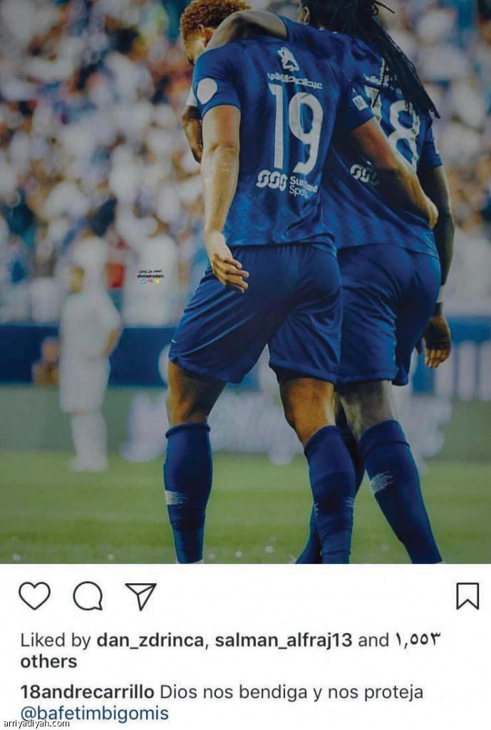 نشر البيروفي أندريه كاريلو، محترف فريق الهلال الأول لكرة القدم، صورة جمعته بالفرنسي بافيتيمبي جوميز، زميله في الفريق، عبر حسابه في موقع التواصل الاجتماعي “إنستجرام”. جاء ذلك قبل انطلاق مواجهة فريقه أمام التعاون، أمس، ضمن دوري كأس محمد بن سلمان للمحترفين. وأرفق كاريلو تعليقًا مع الصورة، كتب فيه: “أسأل الله التوفيق. ليبارك فينا الله ويحمينا”. ونالت تدوينة كاريلو خلال ساعة واحدة 26.018 إعجابًا.