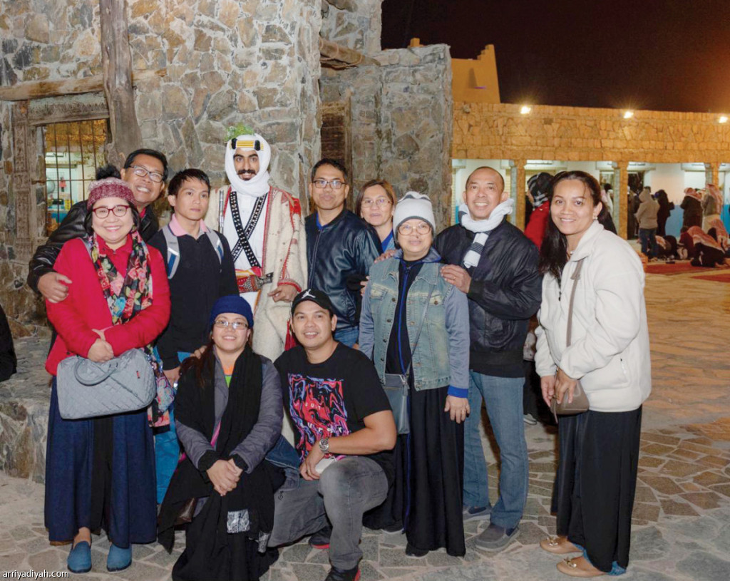 صورة التقطت أمس لرجل يرتدي الجبة وزوار أجانب يلتفون حوله في الجنادرية (واس)