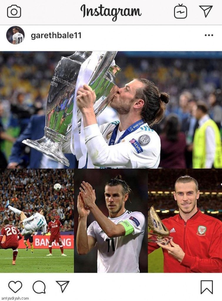 استعرض الويلزي جاريث بيل لاعب ريال مدريد الإسباني لكرة القدم أبرز اللحظات الجميلة التي حققها مع ناديه خلال عام 2018. وبث صورة لأبرز الإنجازات والبطولات التي ساهم في تحقيقها والتي يعد أبرزها دوري أبطال أوروبا بعد تسجيله هدفين في النهائي الكبير. ونالت الصورة نحو 700 ألف إعجاب وأكثر من 2000 تعليق من متابعي النجم العالمي خلال 15 ساعة من بثها.