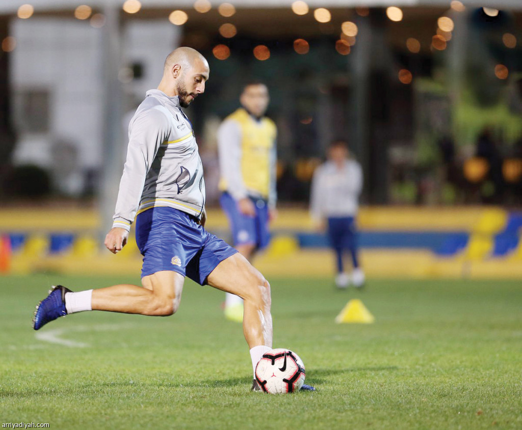 صورة التقطت أمس لنور الدين أمرابط يسدد الكرة في المناورة التي فرضها هيلدر مدرب الفريق استعدادًا لمواجهة فريق الجندل (المركز الإعلامي ـ النصر)