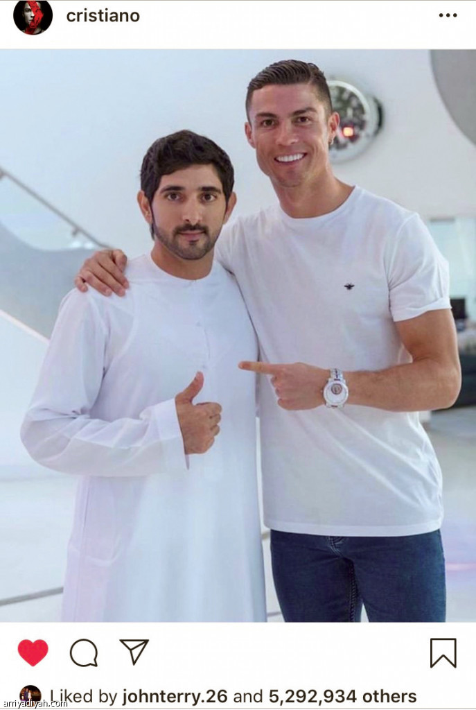 شهدت صورة كريستيانو رونالدو مع حمدان بن محمد بن مكتوم ولي عهد إمارة دبي الإماراتية مساء أمس عبر موقع التواصل الاجتماعي “إنستجرام” نحو 5 ملايين إعجاب وأكثر من 26 ألف تعليق من متابعي النجم البرتغالي العالمي. ويقضي رونالدو إجازته هذه الأيام في مدينة دبي، وشهدت الصورة انتشاراً واسعاً في منصات التواصل الاجتماعي، وشارك بعض نجوم العالم بنشر إعجابهم على هذه الصورة مثل جون تيري وديبالا .