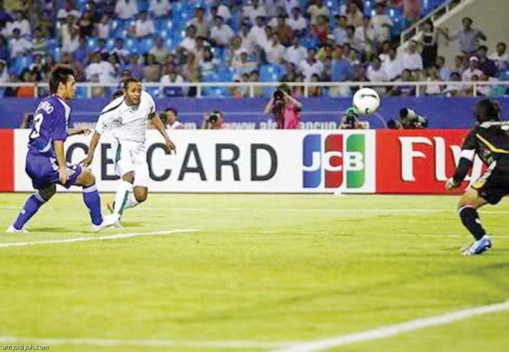 صورة التقطت لمعاذ لحظة تسديد الكرة نحو مرمى اليابان مسجلاً الهدف الثالث الذي قاد الأخضر إلى المباراة النهائية في كأس آسيا 2007 (أرشيفية)