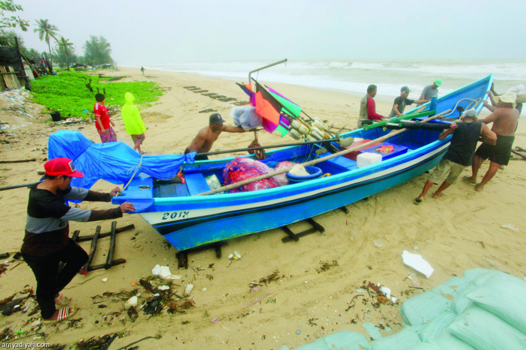 صورة التقطت أمس لصيادين تايلانديين في محافظة سونجكلا الجنوبية ينقلون قاربهم إلى مكان آخر أكثر أمانًا لتجنيبه العاصفة (أسوشيتد برس)