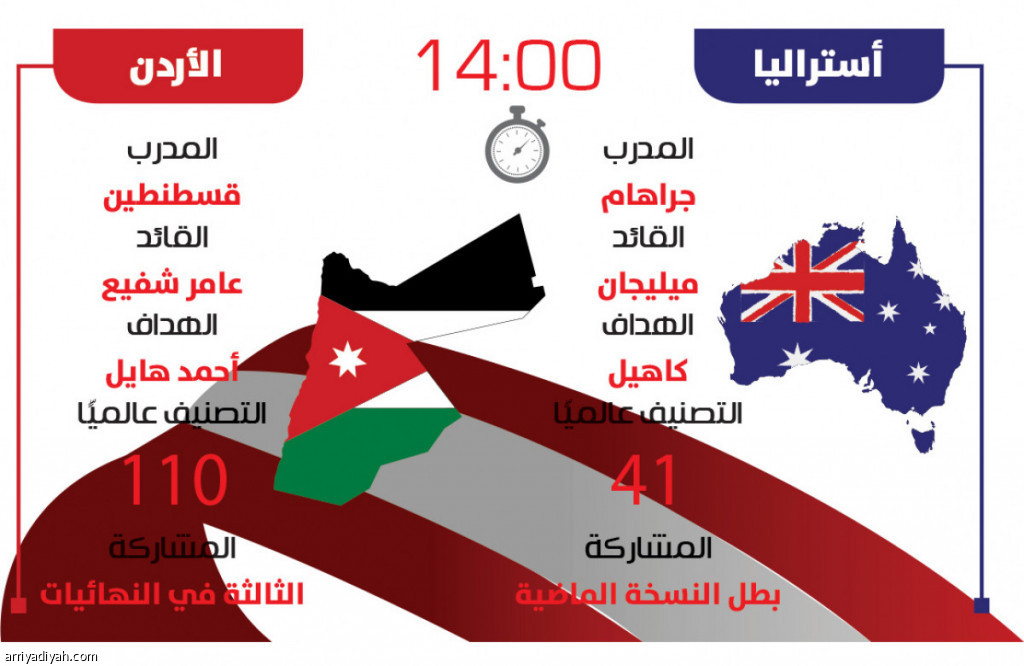 يستهل منتخب أستراليا الأول لكرة القدم حملة الدفاع عن لقبه في بطولة كأس آسيا 2019، من خلال المواجهة المرتقبة مع نظيره الأردني على ملعب هزاع بن زايد في مدينة العين. ويخوض الأسترالي هذه النسخة فريق مختلف، حيث يضم ثمانية لاعبين فقط من قائمة الـ 23 لاعبًا، التي خاض بها النسخة الماضية عندما تغلب على منتخب كوريا الجنوبية في المباراة النهائية. أما الأردني يطمح إلى تقديم وجه مختلف في النسخة الحالية، بعد خروجه من الدور الأول في البطولة الماضية. وقال فيتال بوركلمانس، مدرب المنتخب، إنه وضع أهدافًا رئيسة يتطلع إلى تحقيقها، لكنَّ الخطوة الأولى تبدأ من العبور إلى الدور الثاني عن المجموعة الثانية.