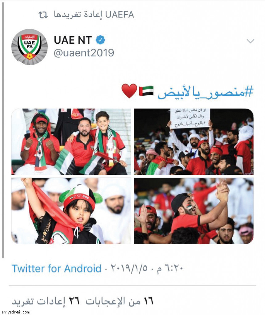 تغنى الحساب الرسمي للمنتخب الإماراتي عبر موقع التواصل الاجتماعي “تويتر” بالجماهير الإماراتية التي ساندت منتخب بلادها في أولى مبارياته أمام المنتخب البحريني أمس، ونشر القائمون على الحساب صوراً للجماهير إضافة إلى كتابة تعليق: منصور يا الأبيض. يذكر أن كأس آسيا انطلق أمس بمواجهة الإمارات والبحرين.