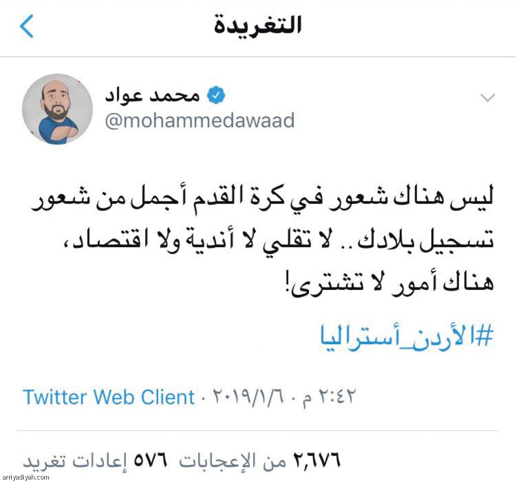 سيطر فوز المنتخب الأردني على أستراليا أمس بهدف نظيف ضمن منافسات الجولة الأولى من بطولة نهائيات كأس آسيا 2019م على مواقع التواصل الاجتماعي "تويتر"، إذ تداول اسم الأردن أكثر من 20 ألف مغرد في الطائر الأزرق، ونال عامر شفيع حارس المرمى الاسم الأكثر تداولاً من بقية زملائه، كما سجل فيديو تصديه للهدف الأسترالي المحقق في آخر دقيقة من عمر المباراة الفيديو الأكثر انتشاراً ومشاهدة بنحو 60 ألف مشاهدة خلال 3 ساعات من بثه.