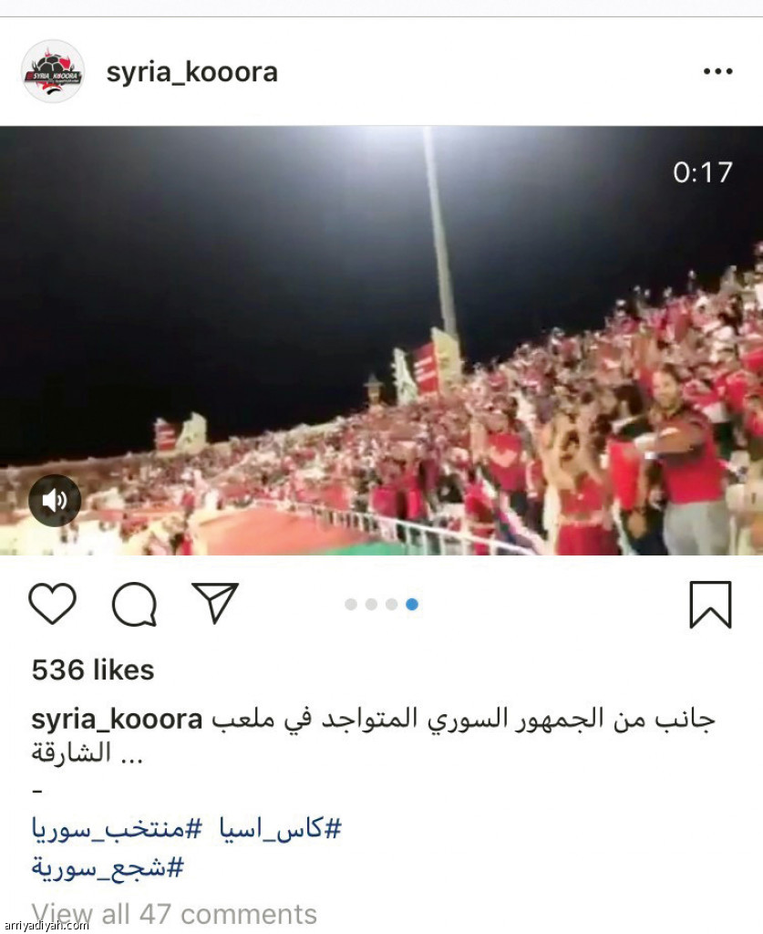 تغنى حساب الكرة السورية عبر موقع التواصل الاجتماعي “إنستجرام” بالحضور الجماهيري الكبير لمنتخب سوريا مساء أمس في أولى مبارياته أمام فلسطين ضمن منافسات الجولة الأولى من بطولة نهائيات كأس آسيا 2019م المقامة هذه الفترة في الإمارات، ونالت نحو 1500 معجب خلال ساعة واحدة من بثها.