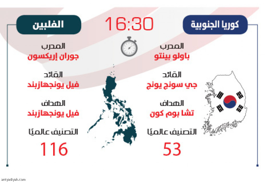 يلتقي منتخب كوريا الجنوبية نظيره الفلبيني على ملعب آل مكتوم في دبي، اليوم، ضمن الجولة الأولى من منافسات المجموعة الثالثة في كأس آسيا 2019 في الإمارات.ويتطلع منتخب كوريا الجنوبية إلى شق طريقه دون عناء صوب الأدوار الإقصائية، فيما يخوض منتخب الفلبين البطولة دون ضغوط جماهيرية، لكنَّه يسعى إلى ترك انطباع جيد.