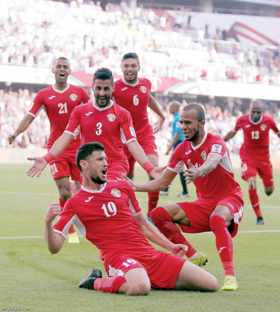 صورة التقطت أمس لأنس بني ياسين لاعب المنتخب الأردني يحتفل مع زملائه بتسجيله هدف الفوز على أستراليا (الألمانية)
