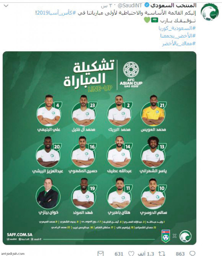 سجلت صورة تشكيلة الأخضر الأكثر انتشارًا في الهاشتاق، التي أعلنها حساب المنتخب السعودي الرسمي قبل المباراة، حيث بلغ عدد التفاعلات مع الصورة 182 ألفًا.