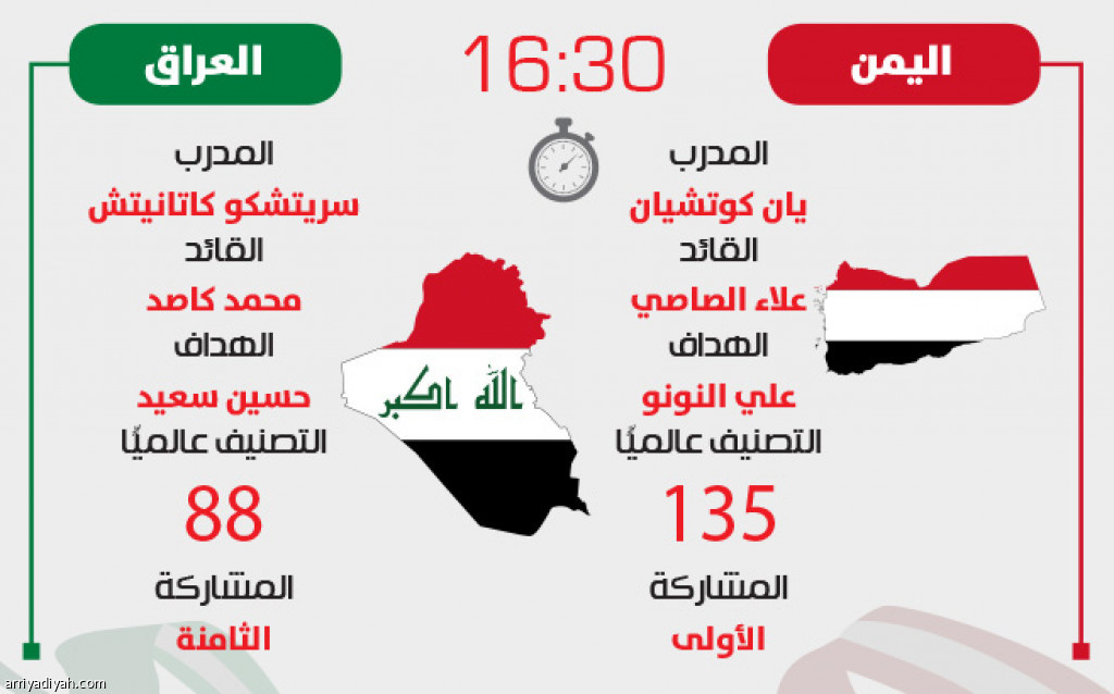 يلتقي منتخب العراق مع اليمن اليوم على ملعب مدينة الشارقة، ضمن الجولة الثانية من منافسات المجموعة الرابعة في كأس آسيا 2019 المقامة في الإمارات.