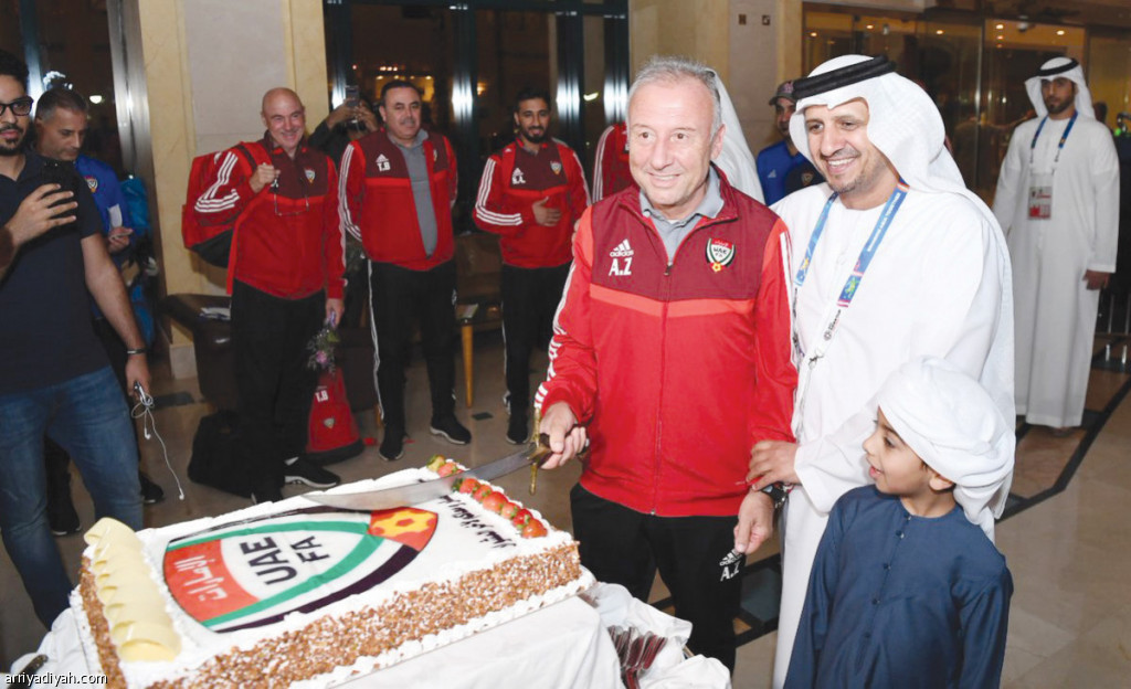 وقدمت المجموعة "كعكة كبيرة" للمنتخب الإماراتي بمناسبة الوصول إلى العين، قطعها الإيطالي ألبرتو زاكيروني، بحضور اللاعبين.
