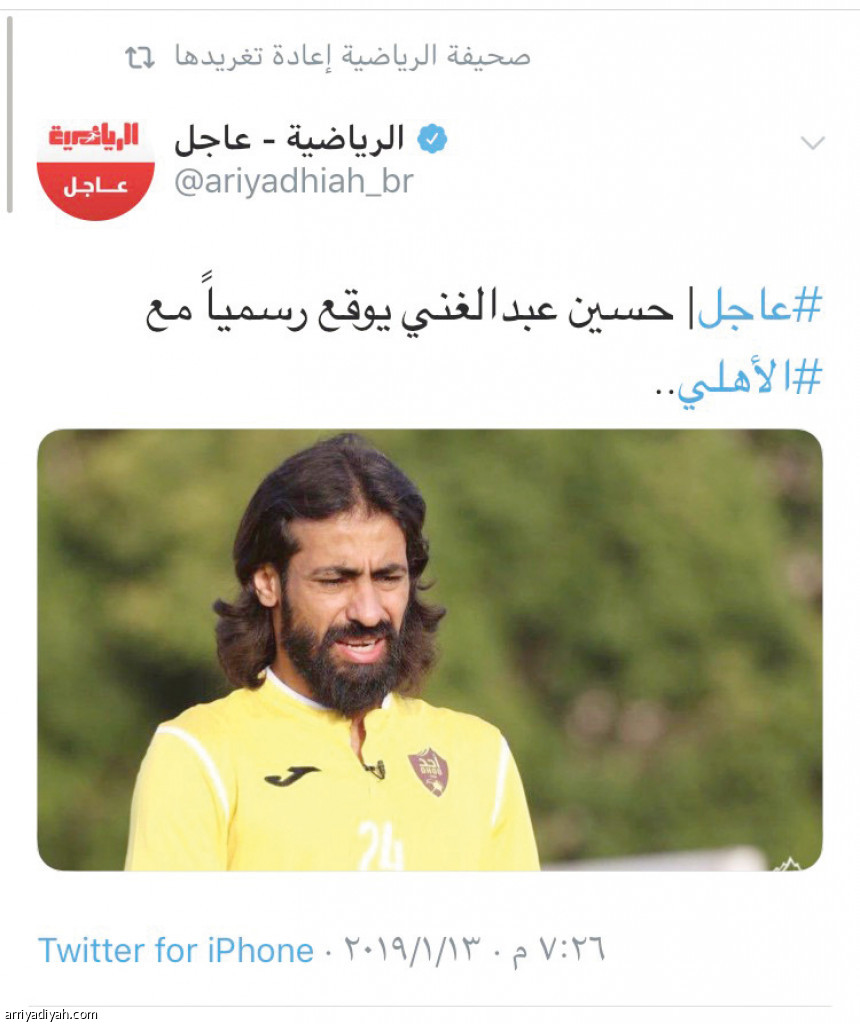 نالت تغريدة حساب "الرياضية عاجل" عبر موقع التواصل الاجتماعي "تويتر" والتي كان محتواها "حسين عبدالغني يوقع رسمياً مع الأهلي" نحو 150 ألف مشاهد وزائر للحساب خلال بثها. كما تفاعل نحو 1500 حساب مستخدم في "تويتر" مع التغريدة خلال ساعتين.
