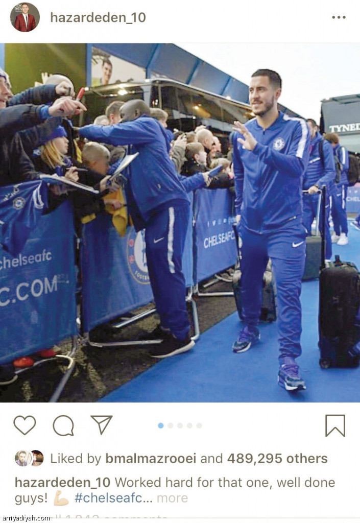 نشر إيدين هازارد قائد فريق تشيلسي الإنجليزي عبر موقع التواصل الاجتماعي “إنستجرام” صوراً من مشاركته أمام فريق نيوكاسل ضمن مباريات الدوري الإنجليزي لكرة القدم، ووصل عدد الإعجابات على الصور نحو 500 ألف خلال 4 ساعات وأكثر من 1900 تعليق من متابعي النجم العالمي.