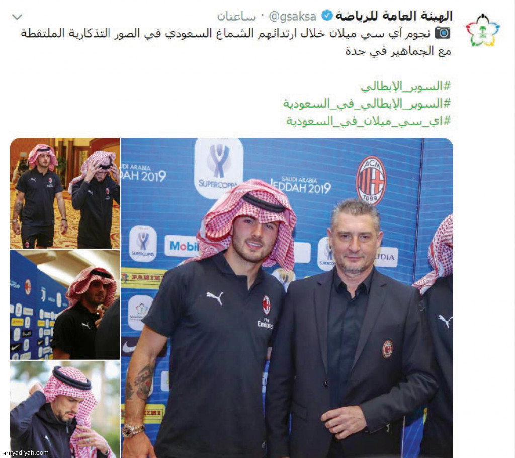 ضوئيتان من تغريدتين لحساب هيئة الرياضة بصور نجوم ميلان أثناء ارتدائهم الشماغ السعودي