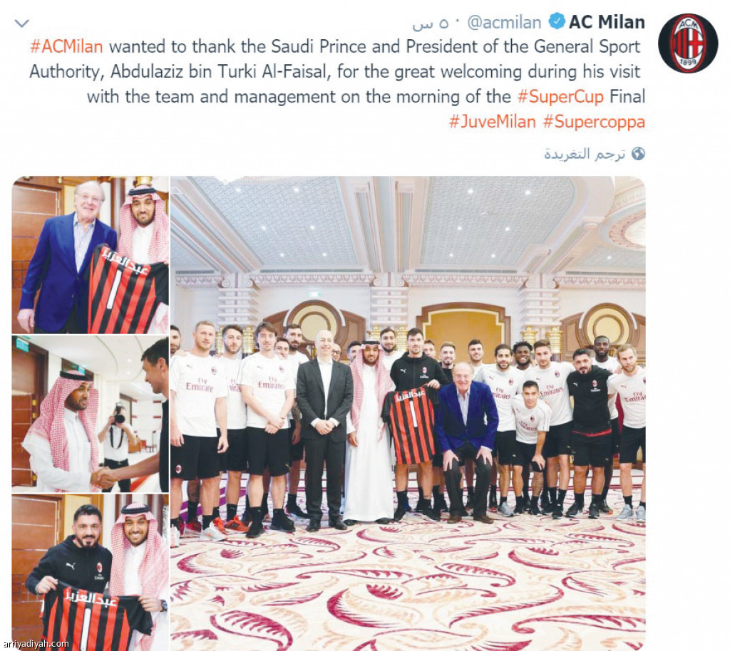وجَّه نادي ميلان الإيطالي الشكر إلى الأمير عبد العزيز بن تركي الفيصل، رئيس الهيئة العامة للرياضة، على الاستقبال المثالي لبعثة الروسونيري في مدينة جدة. ونشر الحساب الرسمي للنادي عبر "تويتر" صورًا لبعثة فريق ميلان الأول لكرة القدم برفقة عبد العزيز بن تركي الفيصل قبل مواجهة يوفنتوس في بطولة كأس السوبر الإيطالي. وكتب الحساب الرسمي لميلان: "ميلان أراد توجيه الشكر إلى الأمير عبد العزيز بن تركي الفيصل، رئيس الهيئة العامة للرياضة في السعودية، على الترحيب العظيم والاستضافة المميزة للفريق في جدة، خلال زيارته لنا".