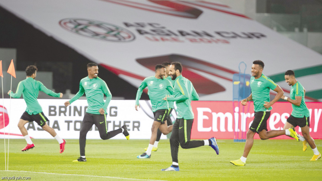 صورة التقطت أمس من تدريبات المنتخب السعودي استعداداً لمواجهة قطر اليوم في ختام مواجهات المجموعة الخامسة من دور المجموعات في كأس الأمم الآسيوية ويبدو سالم الدوسري وعلي البليهي وعبد الله عطيف وحمدان الشمراني وإبراهيم غالب لاعبو الأخضر تصوير: سعد العنزي