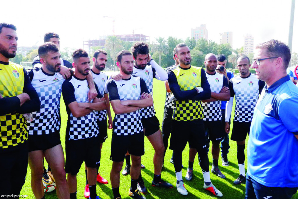 صورة التقطت أمس للاعبي المنتخب الأردني يستمعون إلى حديث مدربهم قبل انطلاق التدريب (المركز الإعلامي ـ منتخب الأردن)