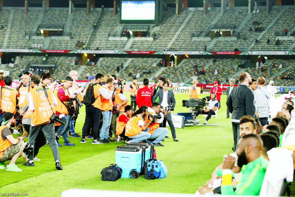 عدد كبير من المصورين يجتمعون أمام دكة احتياط المنتخب السعودي