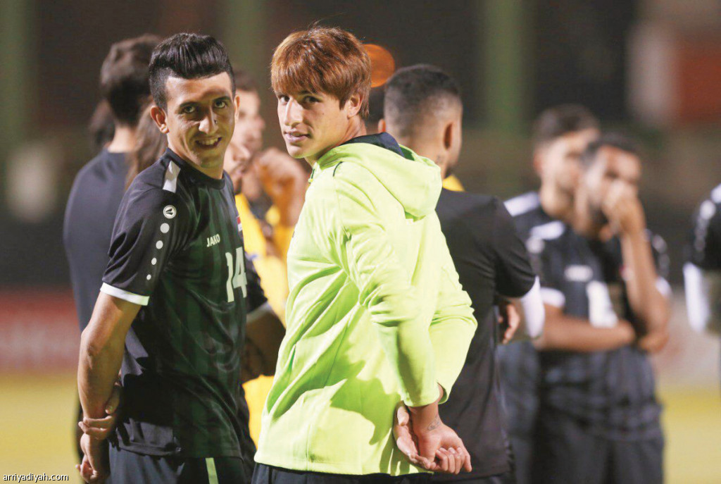 صورة التقطت أمس لمهند علي مهاجم المنتخب العراقي.. وإلى جانبه زميله أمجد عطوان قبل بداية التدريب المسائي (المركز الإعلامي ـ المنتخب العراقي)