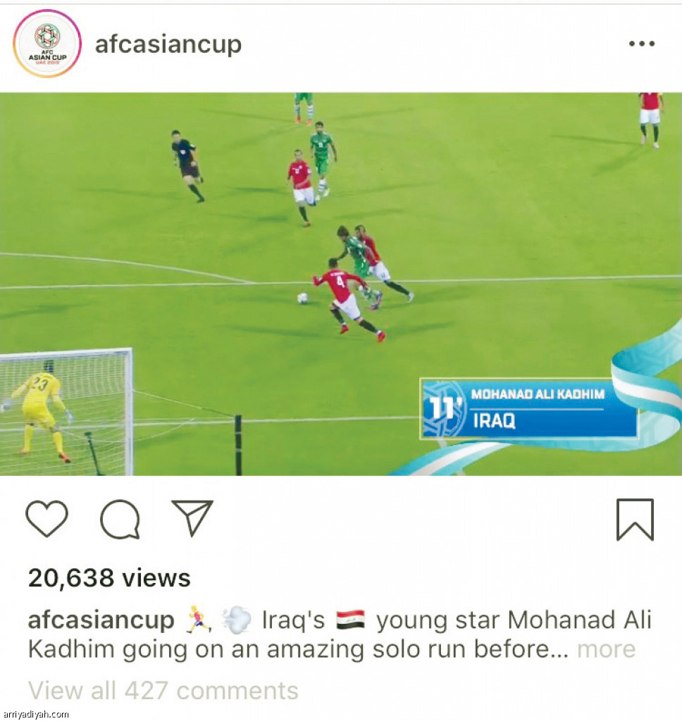 بث الحساب الرسمي لكأس آسيا في موقع التواصل الاجتماعي "إنستجرام" فيديو أهداف المنتخب العراقي في المسابقة القارية خلال مشواره في دور المجموعات، والتي حل فيها ثانياً، ووصل عدد الإعجابات على الصورة نحو 20 ألف إعجاب وأكثر من 430 تعليقاً من متابعي الحساب خلال 4 ساعات من بثه. وأشاد الحساب الرسمي بالمستويات التي قدمها أسود الرافدين في البطولة حتى الآن.