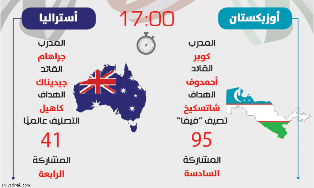 يتواجه منتخب أستراليا مع أوزبكستان اليوم على ملعب خليفة بن زايد في العين، وذلك في دور الـ16 من كأس آسيا 2019 في الإمارات.