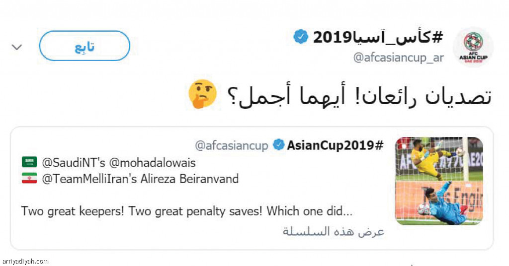 وأثنى حساب بطولة كأس آسيا 2019 في "تويتر" على إمكانات ثنائي حراسة المرمى بعد تصدي كل واحد منهما لركلة جزاء بطريقة مميزة، وتساءل عن الأفضل بينهما.