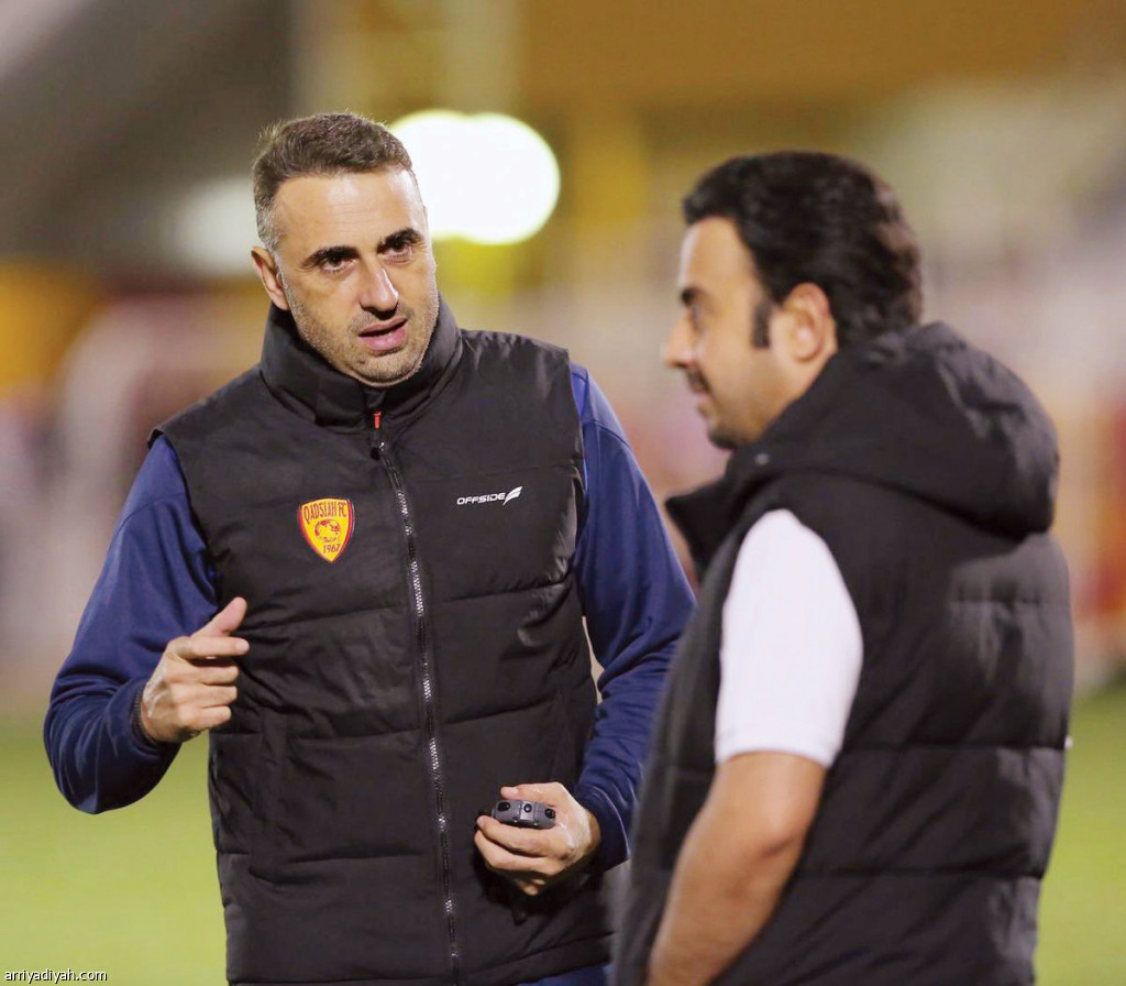 صورة التقطت أمس للبلغاري إيفايلو بيتيفا، مدرب القادسية، يتحدث مع مساعد الزامل، رئيس النادي، خلال حصة تدريبية استعدادًا لاستئناف الدوري (المركز الإعلامي ـ القادسية)