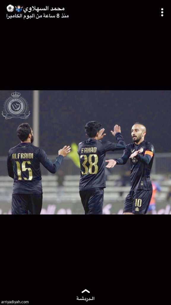 تفاعل النجم محمد السهلاوي لاعب فريق النصر الأول لكرة القدم عبر موقع التواصل الاجتماعي "سناب شات" مع متابعيه بعد أن بث صوراً من مشاركته في مباراة فريقه أمام الفيحاء أمس ضمن منافسات الدور السادس عشر من مسابقة كأس خادم الحرمين الشريفين. وقدم السهلاوي المباركة للجماهير النصراوية بالتأهل إلى الدور المقبل من البطولة. يذكر أن مهاجم النصر شارك في المباراة وصنع الهدف الخامس الذي أحرزه المغربي عبدالرزاق حمدالله.