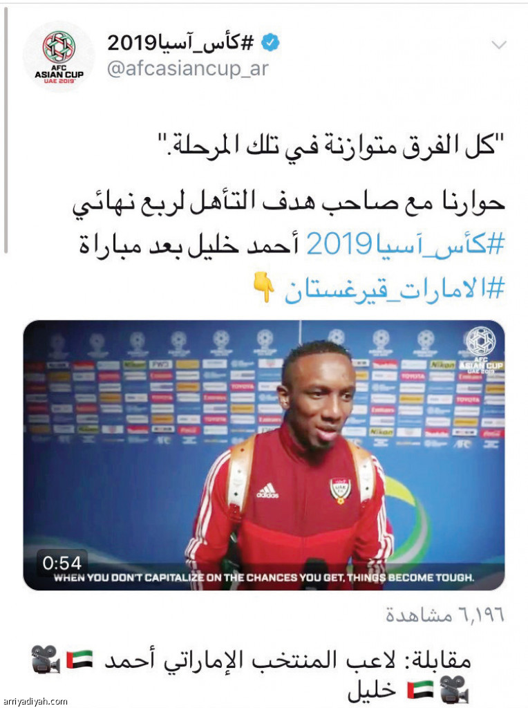 عرض الحساب الرسمي لكأس آسيا في موقع التواصل الاجتماعي “تويتر” فيديو مقابلة المهاجم الإماراتي أحمد خليل الذي سجل هدف منتخب بلاده الحاسم والمؤهل إلى دور الثمانية من نهائيات كأس آسيا وقال خليل خلال المقابلة الحصرية: كل فرق البطولة متوازنة ونال الفيديو على 7 آلاف مشاهدة خلال سبع ساعات من بثه في الطائر الأزرق.