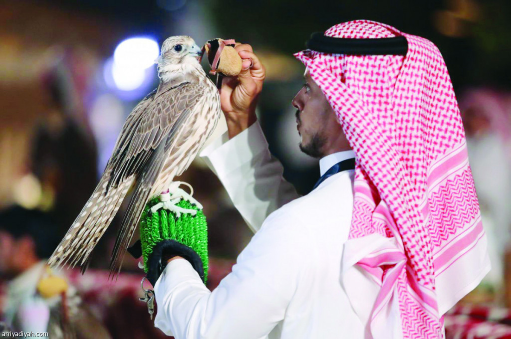 صورة التقطت أمس لأحد الصقَّارين يرتدي المنقلة يُلبس صقره البرقع خلال استعداداته للمشاركة في مهرجان الصقور