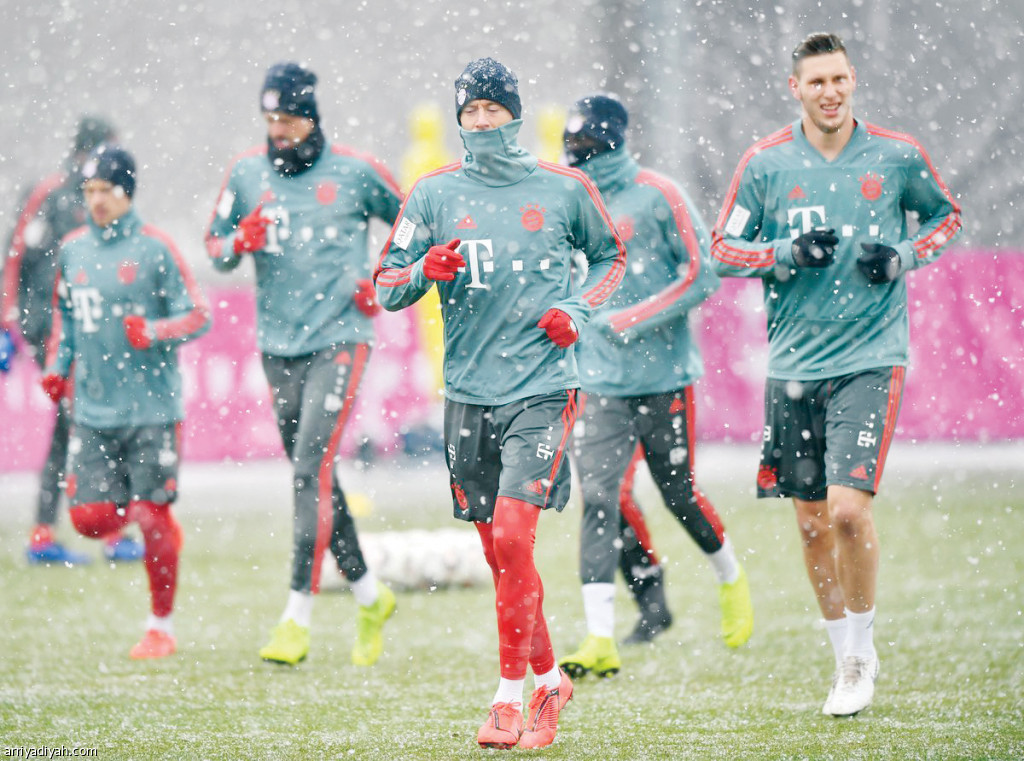 "ثلوج ومطر نتحدى كل الصعاب".. هكذا عبر نادي بايرن ميونيخ في حسابه الرسمي محفزاً اللاعبين على إجراء التمارين على الرغم من الأجواء الصعبة.. وفي الصورة التي التقطت أمس لاعبو البايرن يؤدون التدريبات على ملعب زيبـنر شتراس استعداداً لمواجهة شتوتجارت (المركز الاعلامي ـ بايرن ميونيخ)