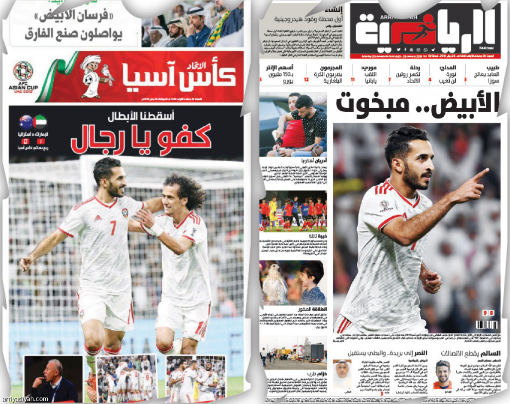 أبرزت وكالة الأنباء الألمانية ما ذكرته صحيفة “الرياضية” في صفحتها الأولى عن تأهل المنتخب الإماراتي إلى نصف نهائي كأس آسيا، وذلك في معرض حديثها عن فوزه على نظيره الأسترالي، وقالت: كتبت الرياضية: “الأبيض.. مبخوت” في إشارة إلى المهاجم علي مبخوت الذي خطف هدف الفوز “1ـ0” على المنتخب الأسترالي.