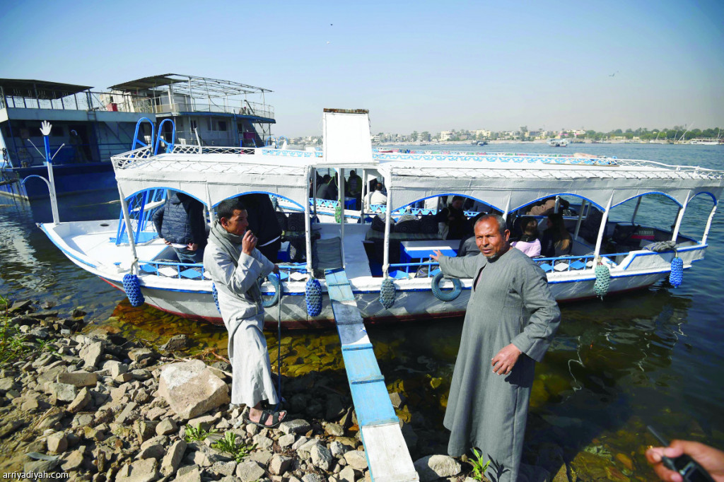 صورة التقطت أمس لاثنين من “المراكبية” المصريين يقفان بالقرب من قارب لنقل السياح على ضفة نهر النيل في مدينة الأقصر جنوب مصر على بعد 650 كيلومتراً من العاصمة القاهرة.. وتنشط في الأقصر سياحة المراكب فضلاً عن سياحة الآثار (الفرنسية)