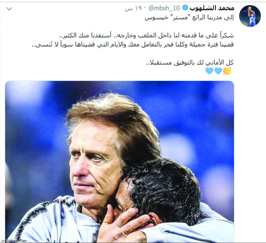 ودَّع محمد الشلهوب، قائد فريق الهلال، البرتغالي خورخي خيسوس، مدرب فريقه المُقال، عبر تغريدة في موقع التواصل الاجتماعي "تويتر".