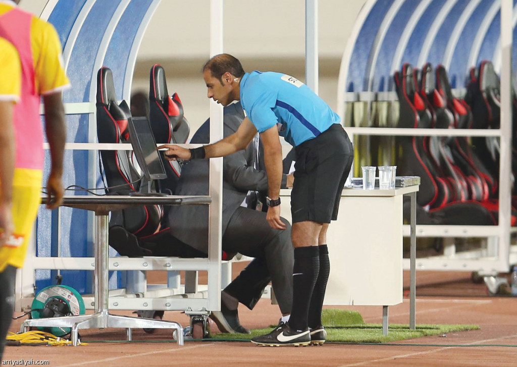 صور التقطت لتركي الخضير الحكم السعودي يُشهر البطاقة الحمراء في وجه محمد مجرشي مهاجم أحد وبرايان أليمان لاعب وسط الاتفاق.. ويظهر في الأولى يلجأ إلى تقنية الـ VAR قبل اتخاذ القرار تصوير: عدنان مهدلي