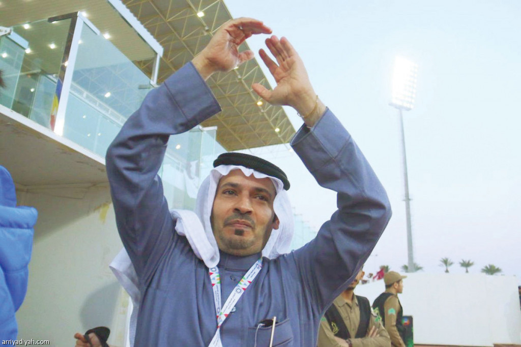 شرح صورة: صورة التقطت أمس لعبد الله المقحم رئيس نادي الحزم يعبِّر عن فرحته بفوز فريقه على الفيصلي (المركز الإعلامي ـ الحزم)