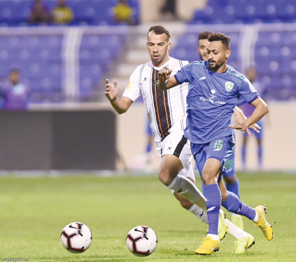 صورة التقطت أمس لمنصور حمزي لاعب فريق الفتح ينطلق بالكرة ومحاولة من الجزائري جمال بلعمري لاعب الشباب لإيقافه تصوير: عيسى الدبيسي