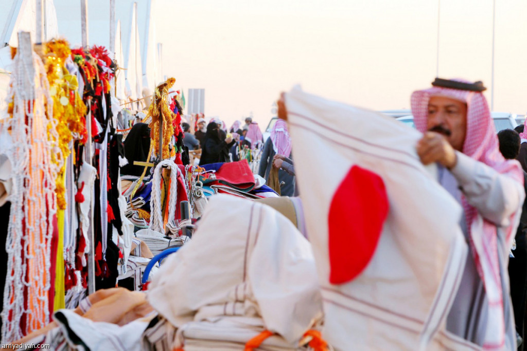صورة التقطت أمس لسوق الدهناء المركز التجاري المحاذي لمهرجان الملك عبد العزيز ويبدو متسوقون يشترون احتياجات إبلهم وبعض المقتنيات الخاصة تصوير: بندر الرمالي