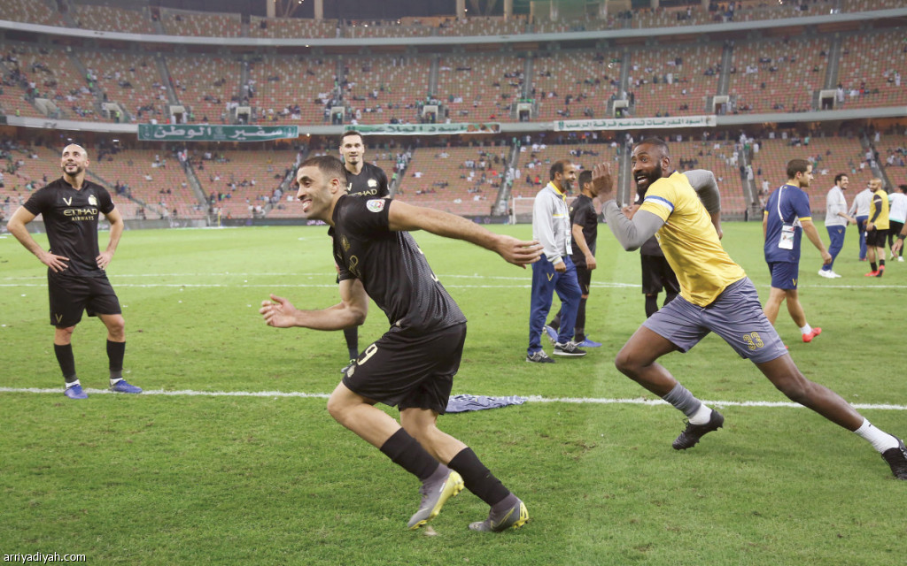 احتفل المغربي عبد الرزاق حمد الله مهاجم النصر الأول لكرة القدم على طريقة زميله وليد عبد الله بعد أن قاد فريقه إلى الفوز على الأهلي 2ـ1.. وفي الصور التي التقطت أمس يظهر حمد الله مع وليد عبد الله ينطلقان في أرجاء الملعب عقب نهاية اللقاء احتفالاً بالانتصار تصوير: عدنان مهدلي
