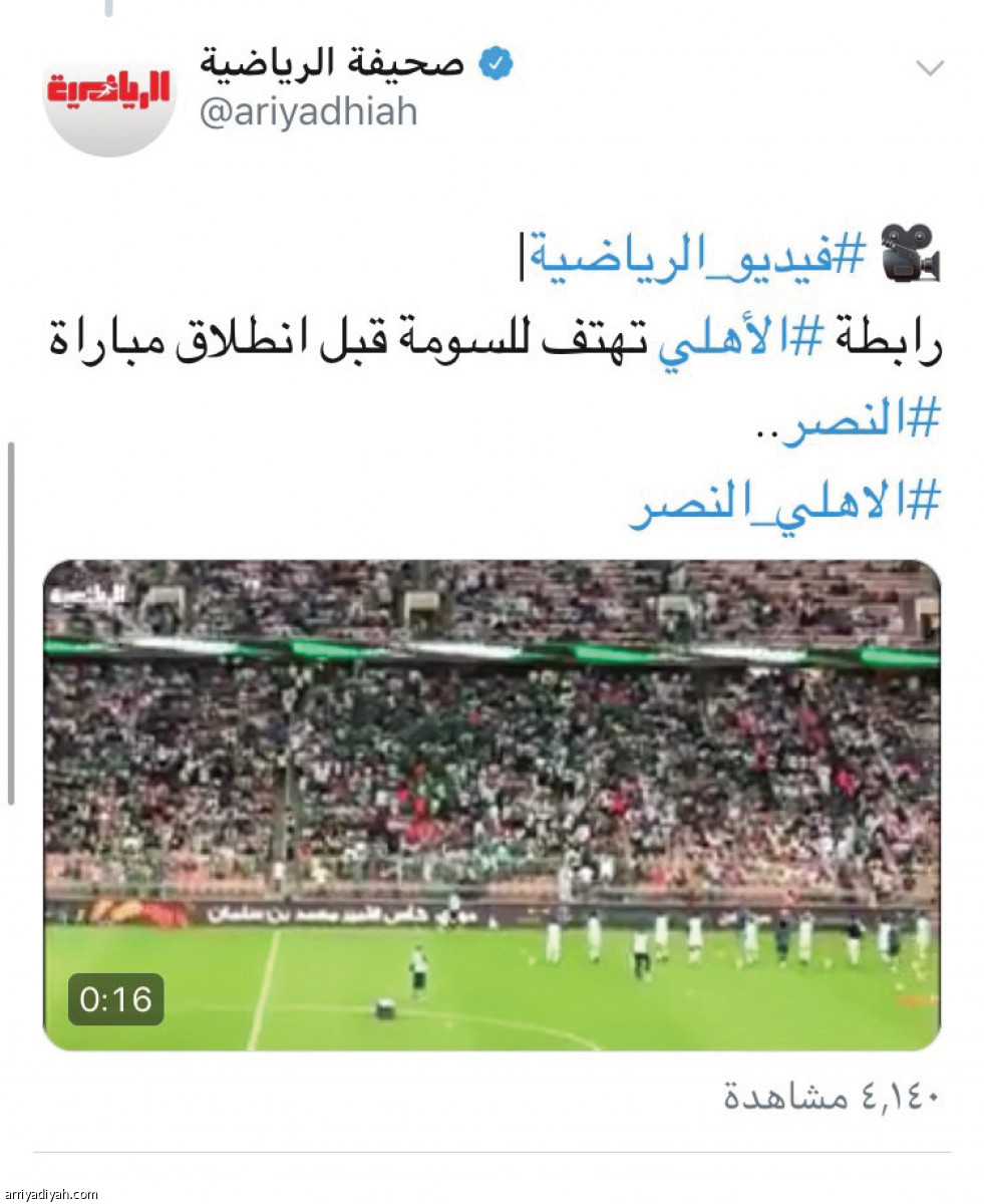 نالت فيديوهات صحيفة "الرياضية" عبر موقع التواصل الاجتماعي "تويتر" والتي واكبت الحضور الجماهيري لقمة كلاسيكو الأهلي والنصر ضمن منافسات الجولة العشرين من دوري كأس محمد بن سلمان للمحترفين نحو 41 ألف متابع خلال ساعات قليلة من بثها في الطائر الأزرق.