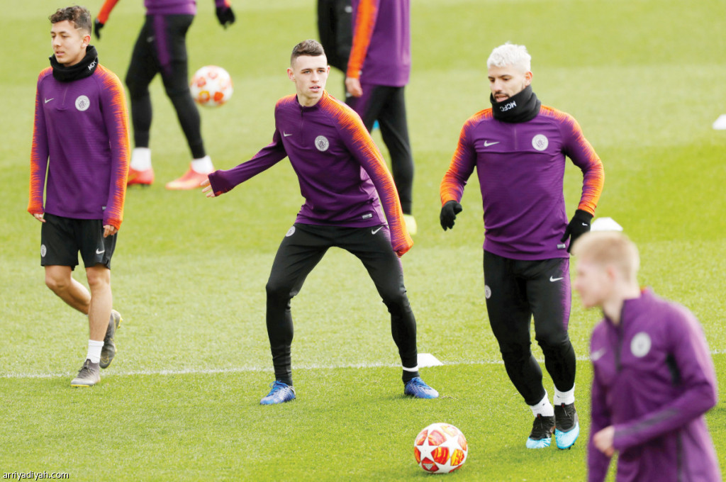 صورة التقطت أمس لأجويرو وعدد من زملائه خلال الحصة التدريبية لفريق مانشستر سيتي استعدادًا لمباراة شالكة اليوم (رويترز)