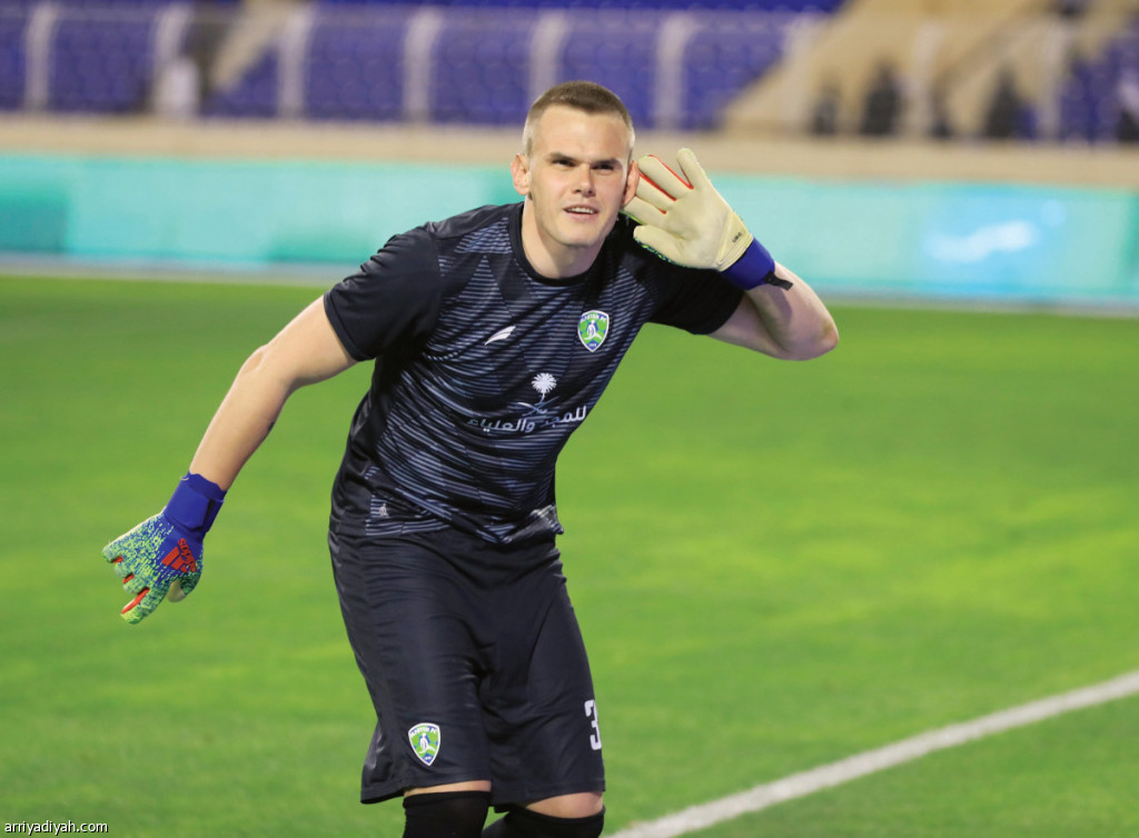صورة التقطت أمس للأوكراني ماكسيم كوفا حارس الفتح يحتفل على طريقته بالانتصار تصوير: عيسى الدبيسي
