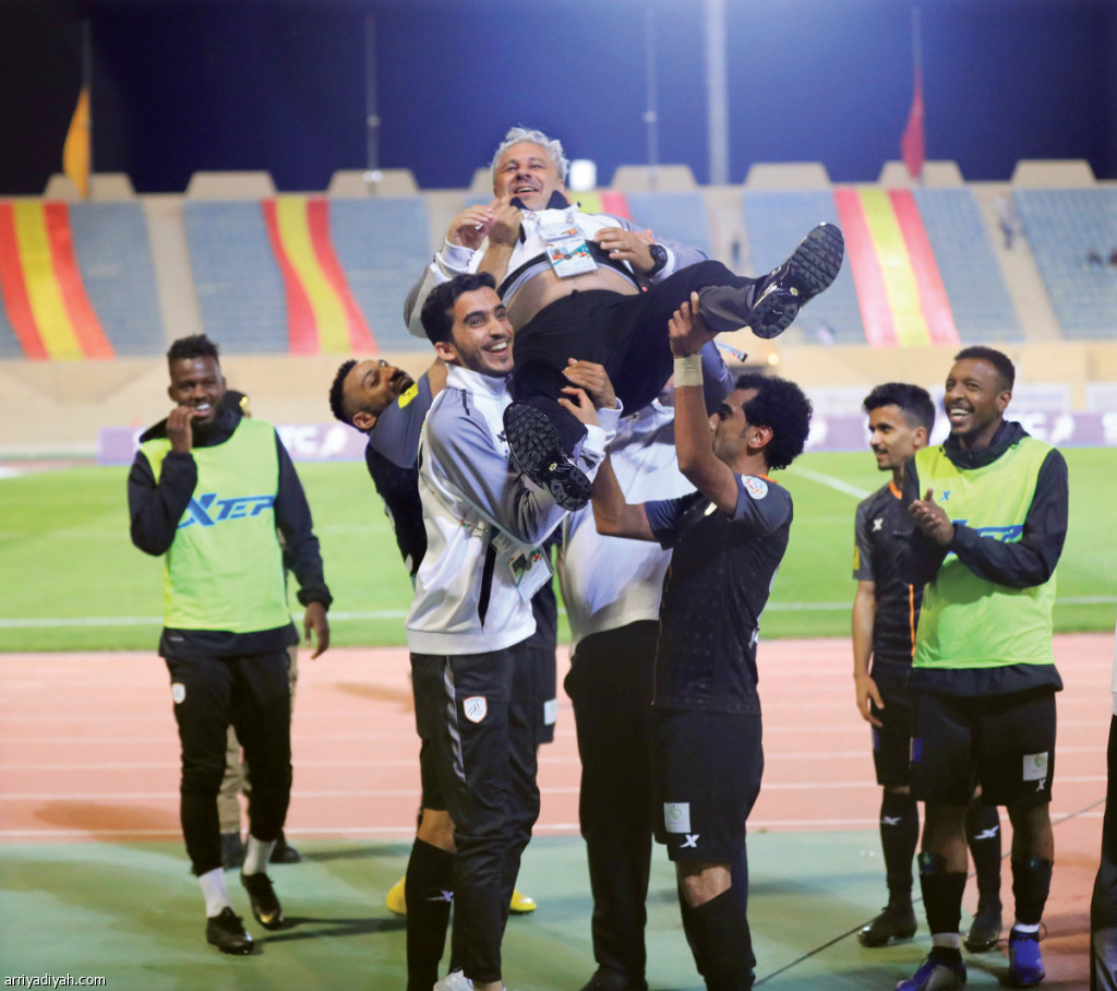 صورة التقطت أمس للاعبي فريق الشباب الأول لكرة القدم يحملون الروماني سوماديكا مدربهم عقب فوزهم على مضيفهم القادسية لحساب الجولة الـ 21 من دوري كأس محمد بن سلمان للمحترفين بهدف نظيف عبر الجزائري بن عمري تصوير: عيسى الدبيسي