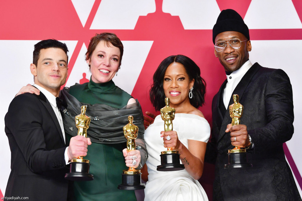 صورة التقطت أمس داخل غرفة الإعلام الخاصة بحفل توزيع جوائز أوسكار في مسرح دولبي بهوليوود الواقعة بلوس أنجليس.. ويظهر من اليسار رامي مالك الأمريكي من أصول مصرية والفائز بجائزة أفضل ممثل عن دوره في "بوهيميان رابسودي" والإنجليزية أوليفيا كولمان الفائزة بجائزة أفضل ممثلة عن دورها في "ذا فيفوريت" والأمريكية ريجينا كينج الفائزة بجائزة أفضل ممثلة مساعدة عن دورها في "إف بيلي ستريت كود توك" والأمريكي ماهرشالا علي الفائز بجائزة أفضل ممثل مساعد عن دوره في "جرين بوك" (الفرنسية)